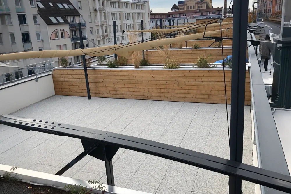 Notre technique de pose sur plots s'adapte à différentes surfaces stabilisées. Elle s'intègre aux terrasses planes, aux toitures-terrasses, aux balcons, et même aux zones légèrement irrégulières avec nos plots ajustables. Cette méthode se révèle efficace sur les étanchéités existantes, les anciennes dalles, le béton et les sols compactés stables. La seule condition est que votre support doit présenter une résistance suffisante pour supporter la charge du système installé.